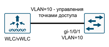 На маршрутизаторе R1 настроен интерфейс с адресом 10.0.0.254. Интерфейс gi-1/0/1 vWLC имеет сетевую связность с R1. На R1 c VLAN=10 настроен адрес 10.0.0.254/24.