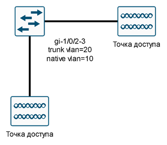 Настроим порты коммутатора, к которым подключены точки доступа. Трафик управления в VLAN=10, а трафик пользователей в VLAN=20.